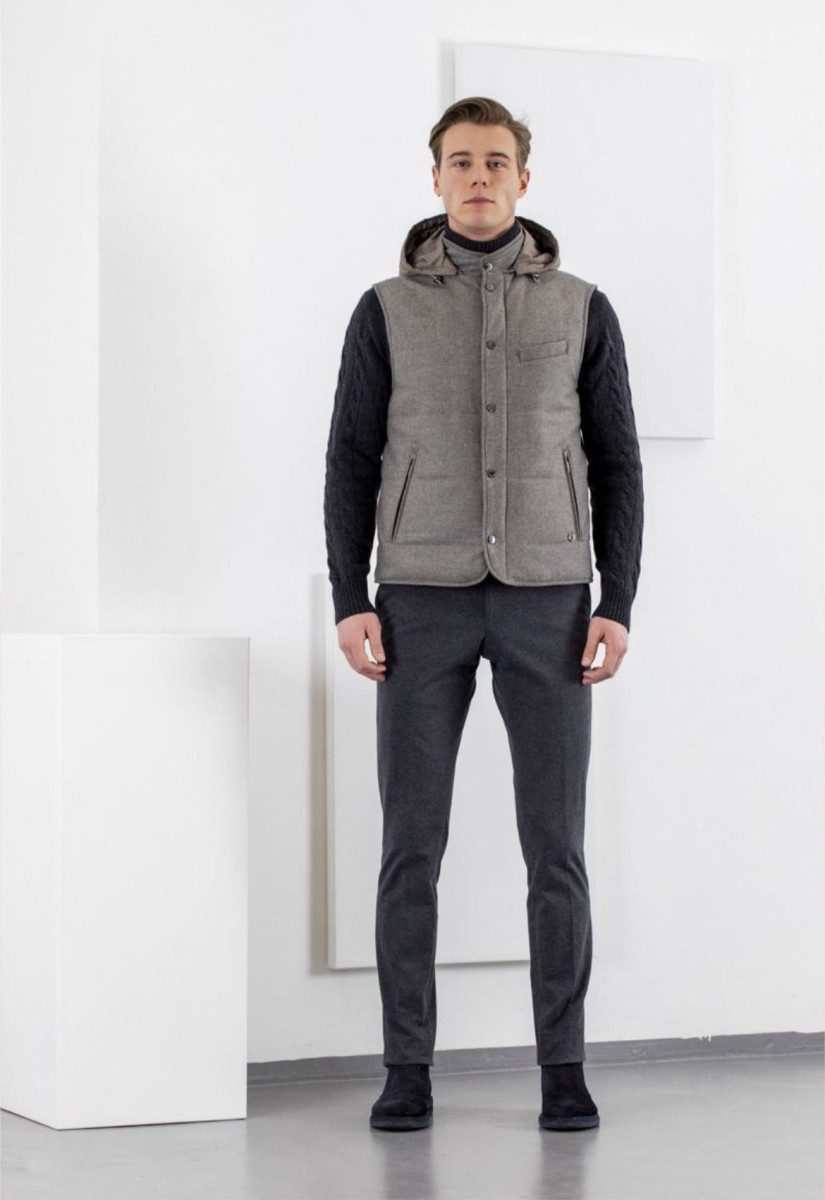 Every model is made from luxurious materials sourced from Italian manufacturers. For outer fabrics, you will often find pure cashmere, baby Suri alpaca, Loro Piana, virgin wool, or Limonta nylon, which is equipped with a water-resistant membrane. Inside the garments, you will discover pockets made of Alcantara or deerskin. Metal components, such as Lanfranchi zippers or Cobrax buttons, are treated with a protective coating to ensure durability.